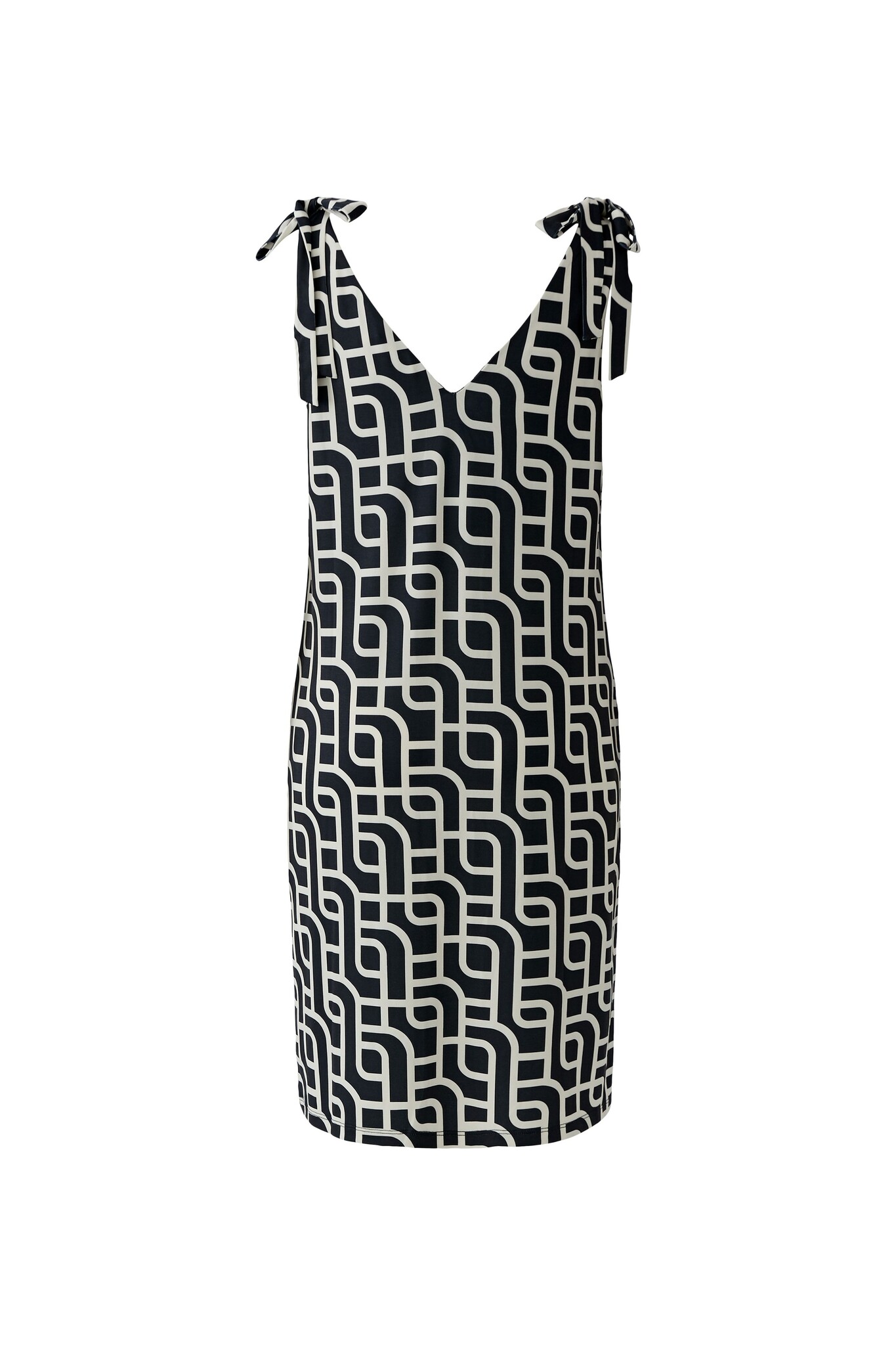 Miss Lagotte Tricot Jurk in de Kleur Zwart/Ecru combinatie met V hals zowel voor als achterkant, knoopbare bandjes en mouwloos.