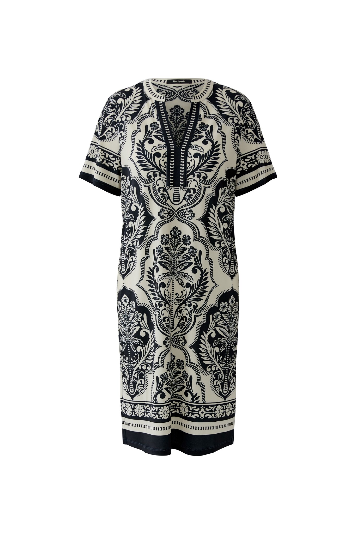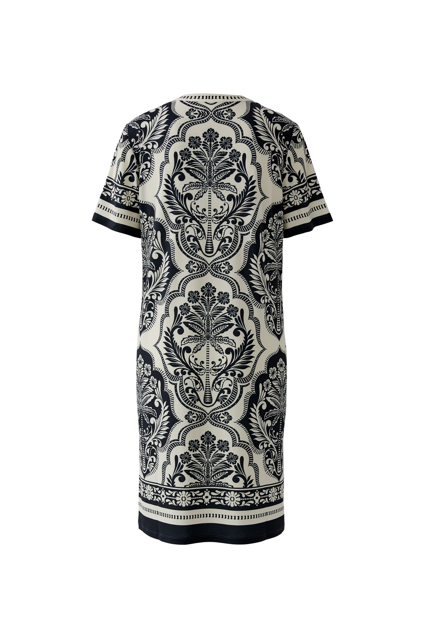Miss Lagotte Tricot Jurk in de Kleur Zwart/Ecru Combinatie met ronde hals en V inzet, korte mouwen en geheel in print.