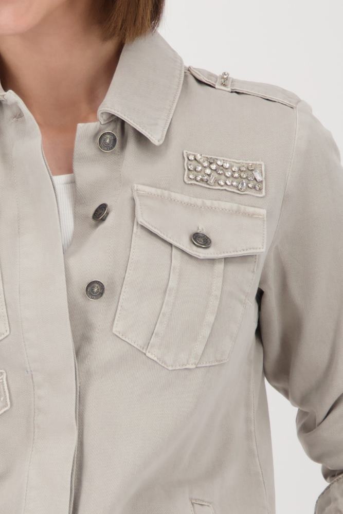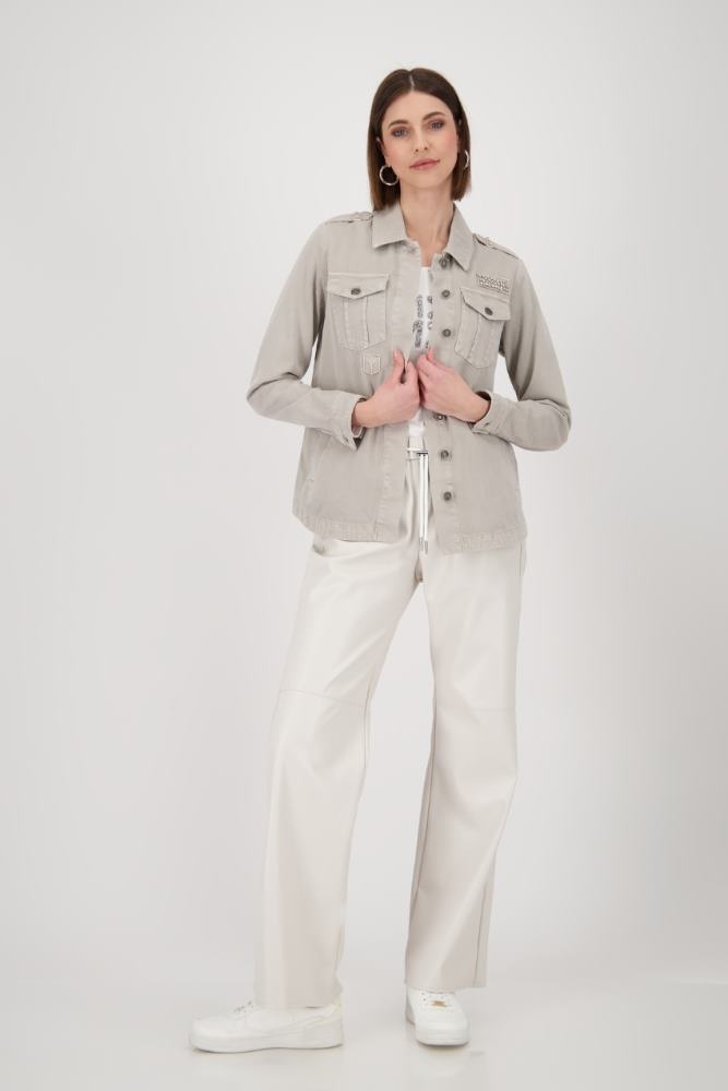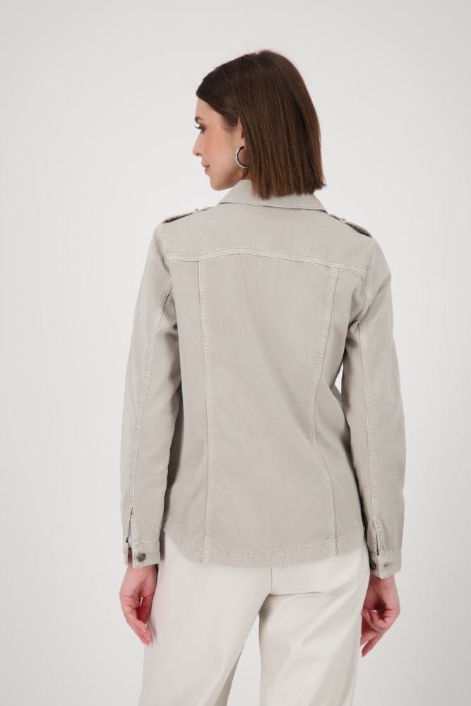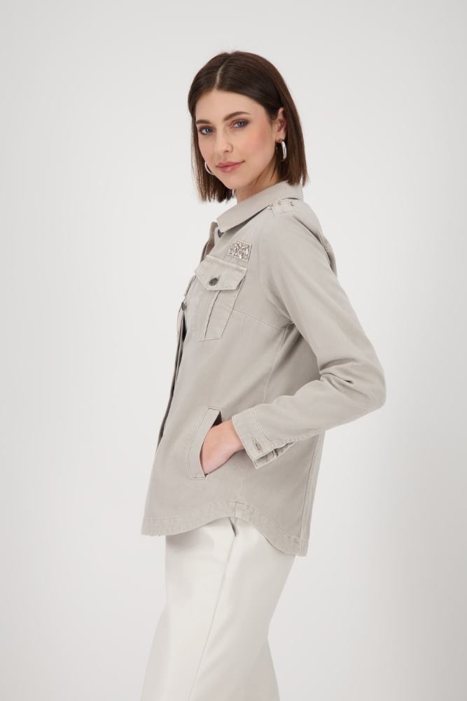 Monari Blouse in de kleur Grege met kraag, knoopsluiting, klepzakken, lange mouwen, rond gesneden. Stevige jeanskwaliteit.
