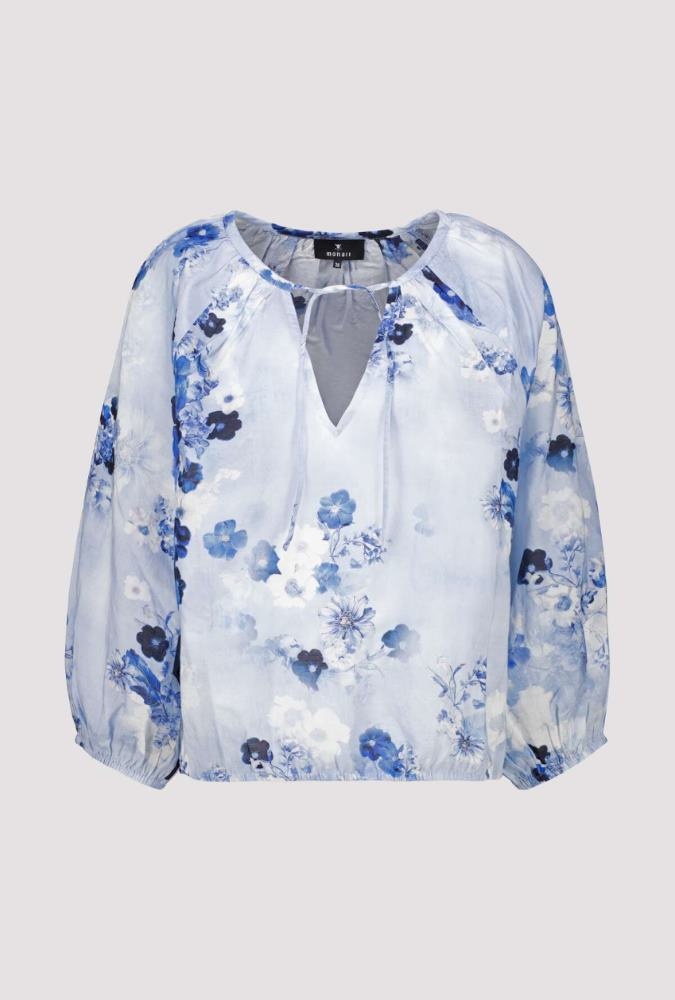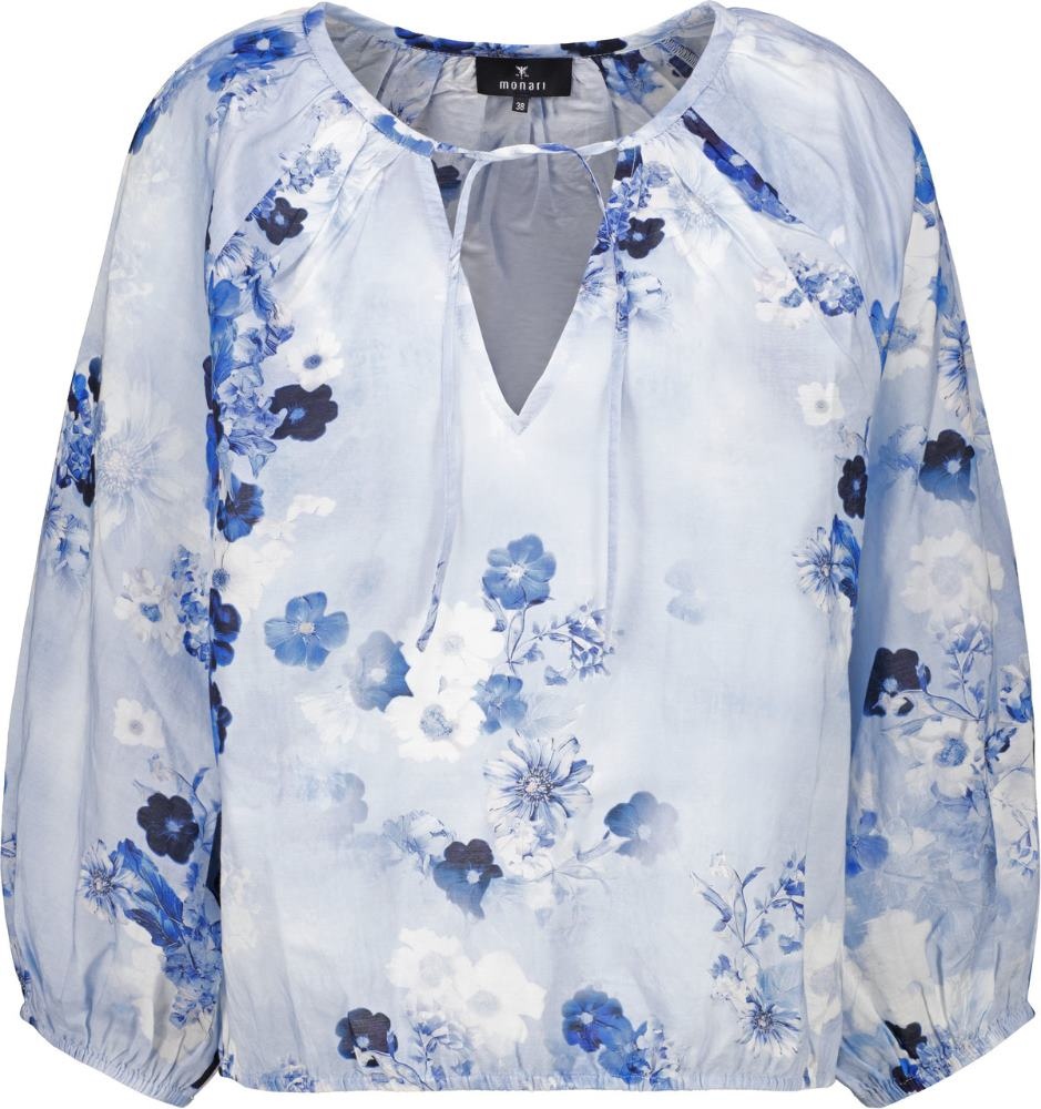 Monari Blouson in de Kleur Blauw Combinatie met ronde hals met strik en V inzet, 3/4 mouwen, elastisch koordje in de boord en geheel in een bloemprint.