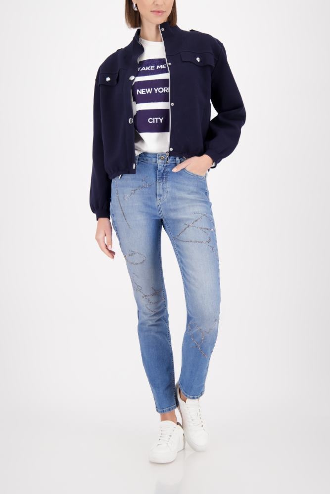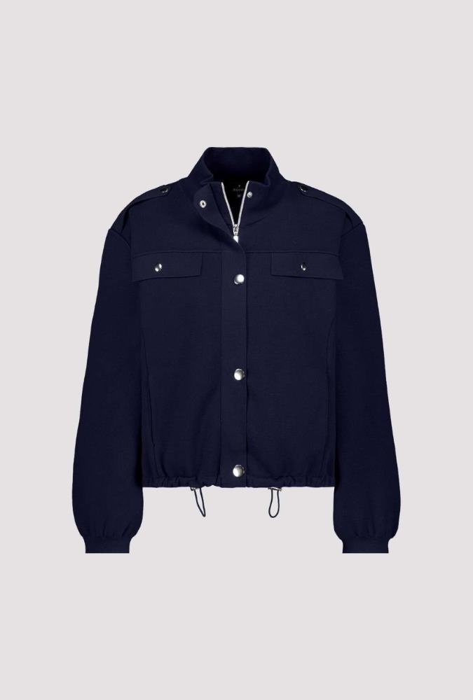 Monari Jasje in de Kleur Marine met staande hals, ritssluiting, Blinde sluiting, lange mouwen. De stof is een mooie stevige kwaliteit.