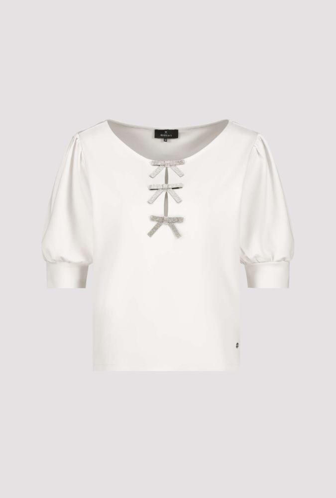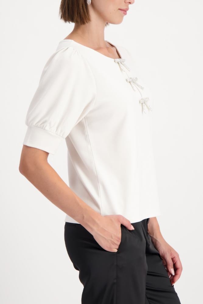 Monari Shirt in de kleur Ivoor met ronde hals met 3 strikjes en halve mouwen met manchetten.