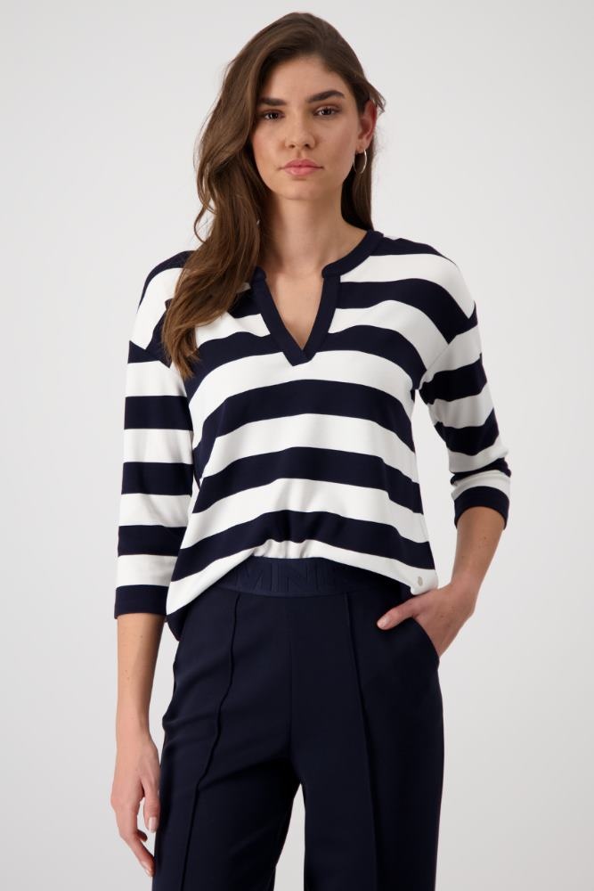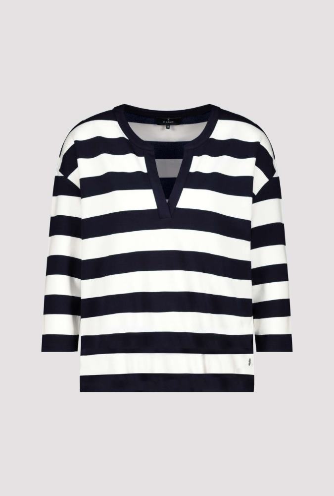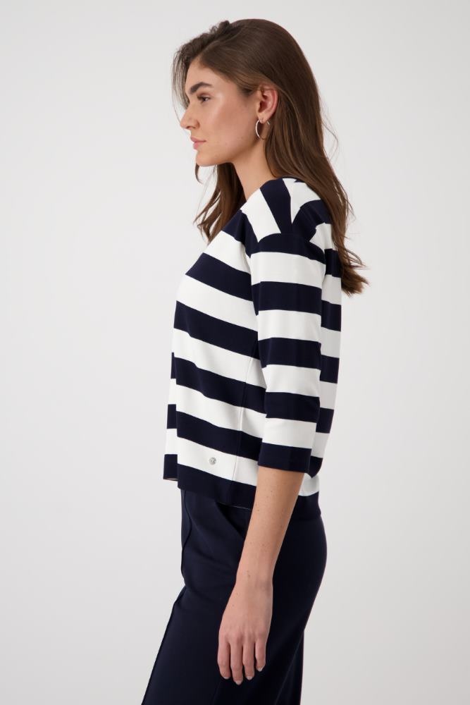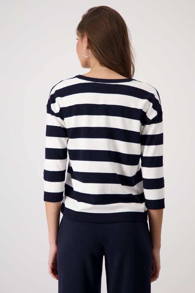 Monari Shirt in het Marine/Offwhite met ronde hals en V inzet, 3/4 mouwen en gestreept.