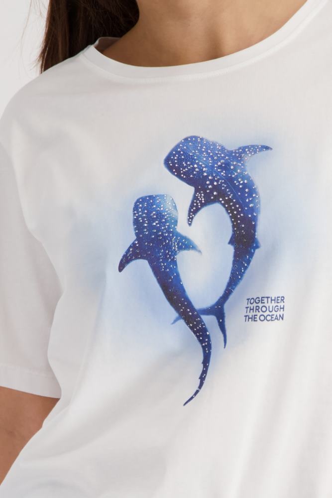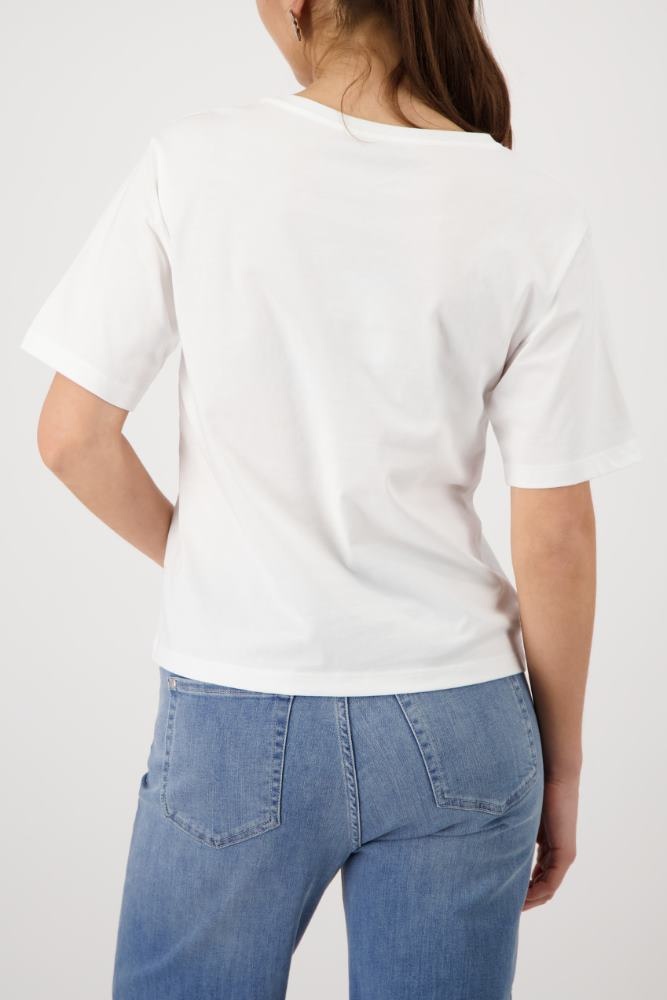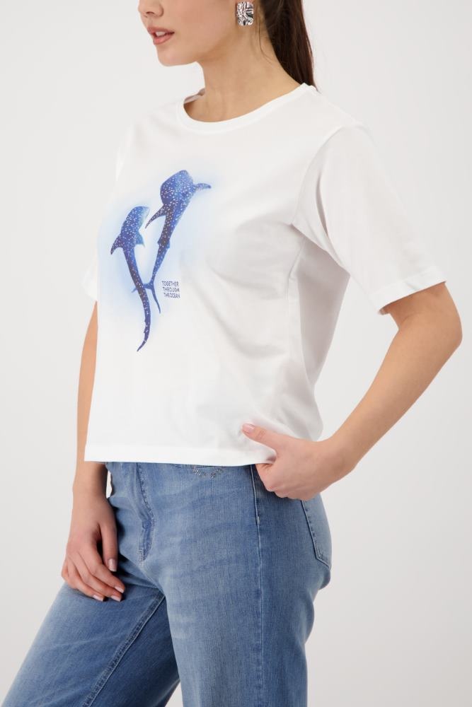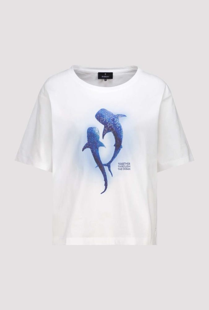 Monari Shirt in de Kleur Offwhite/Blauw met ronde hals, korte m ouwen en een walvisprint met strasssteentjes op de voorkant.