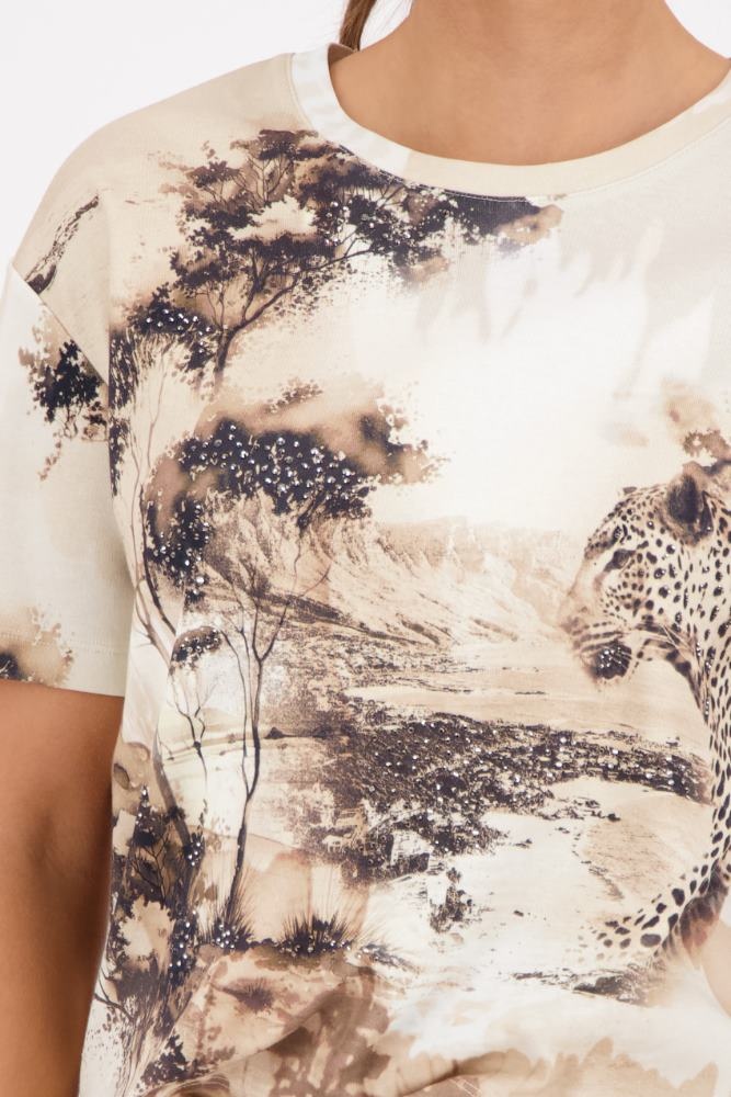 Monari Shirt in de Kleur Zand/Bruin/Offwhite Combinatie met ronde hals, korte mouwen, geheel in een Wildprint en qua pasvorm een iets rechter lopend model.