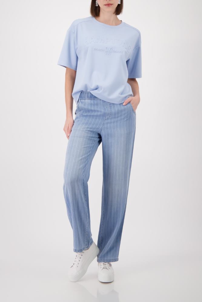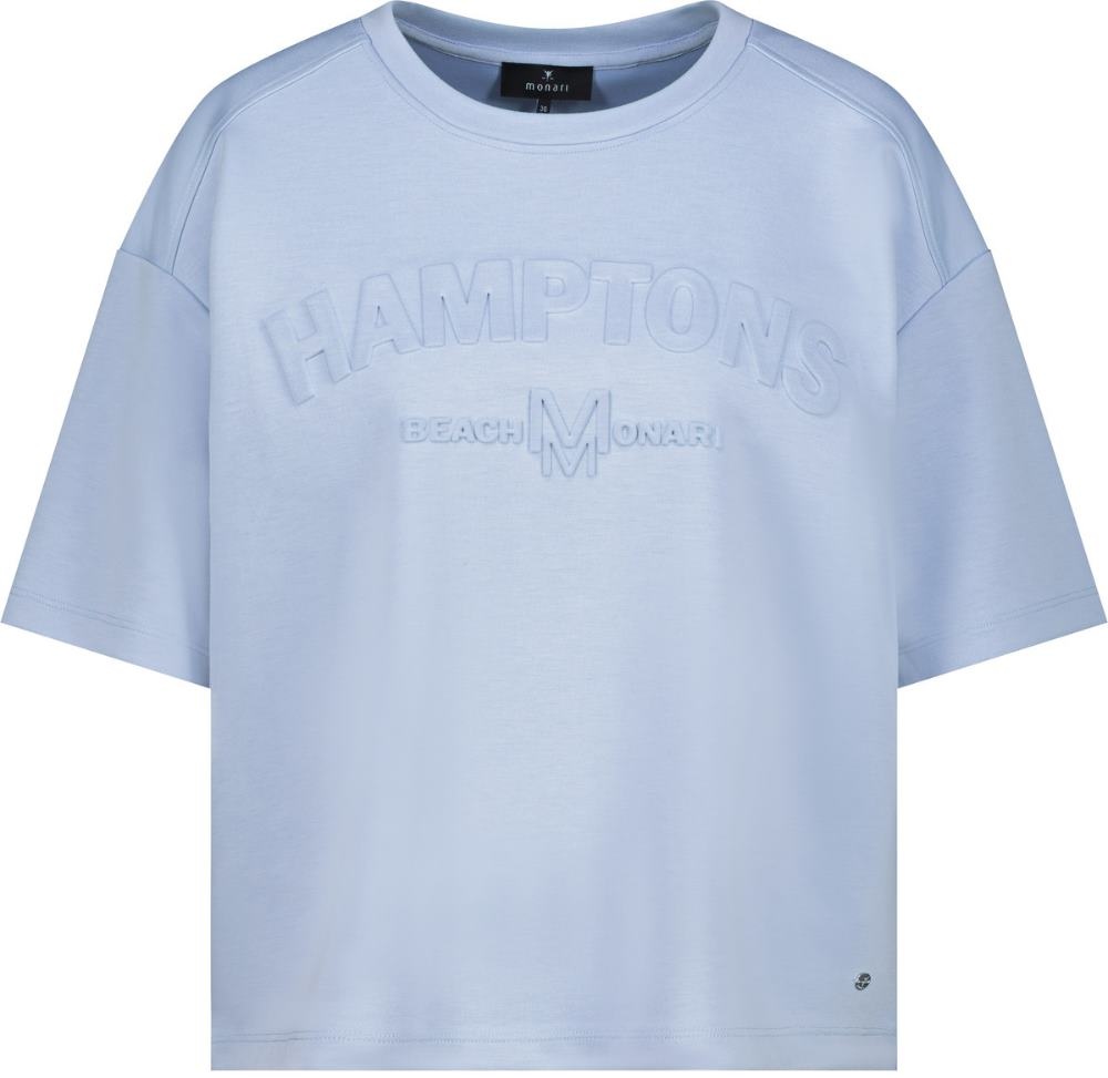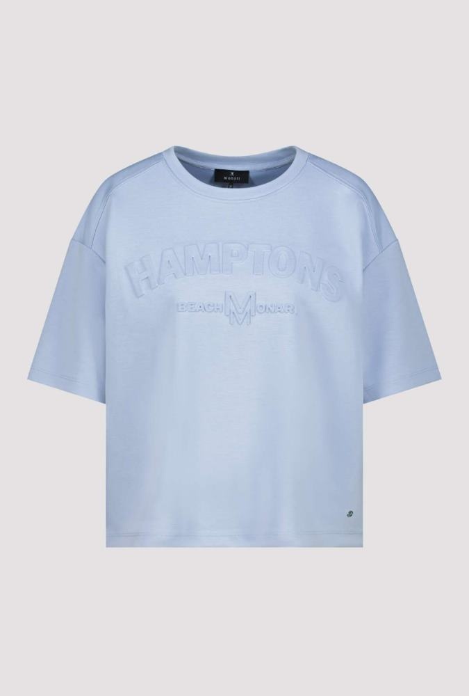 Monari Sweater in de Kleur Blauw met ronde hals, korte mouwen en een ingedrukte tekst aan de voorkant. Kwaliteit is een heerlijke soepele tricot.