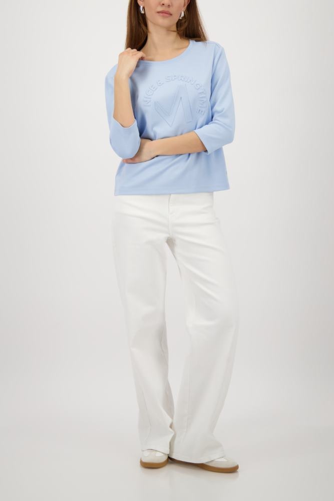Monari Sweater in de Kleur Blue met ronde hals, 3/4 mouwen met ingedrukt rond logo aan de voorkant.