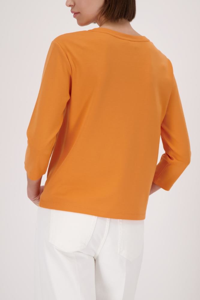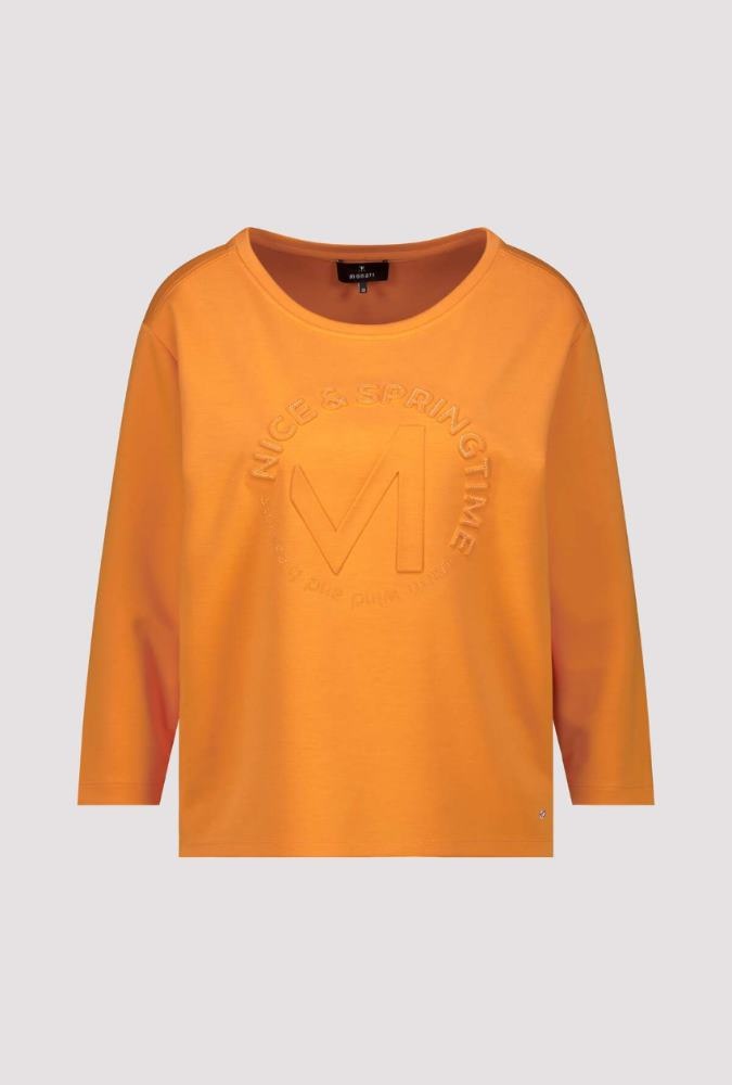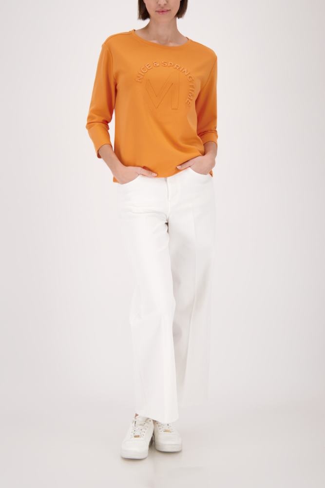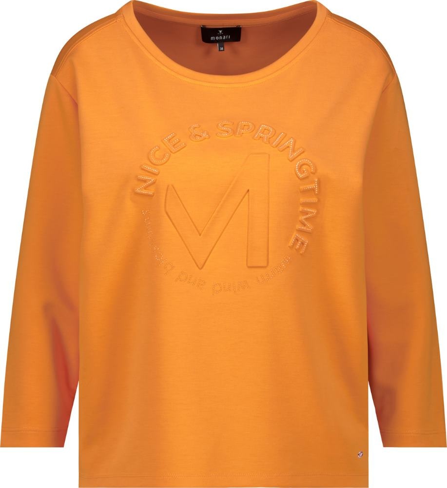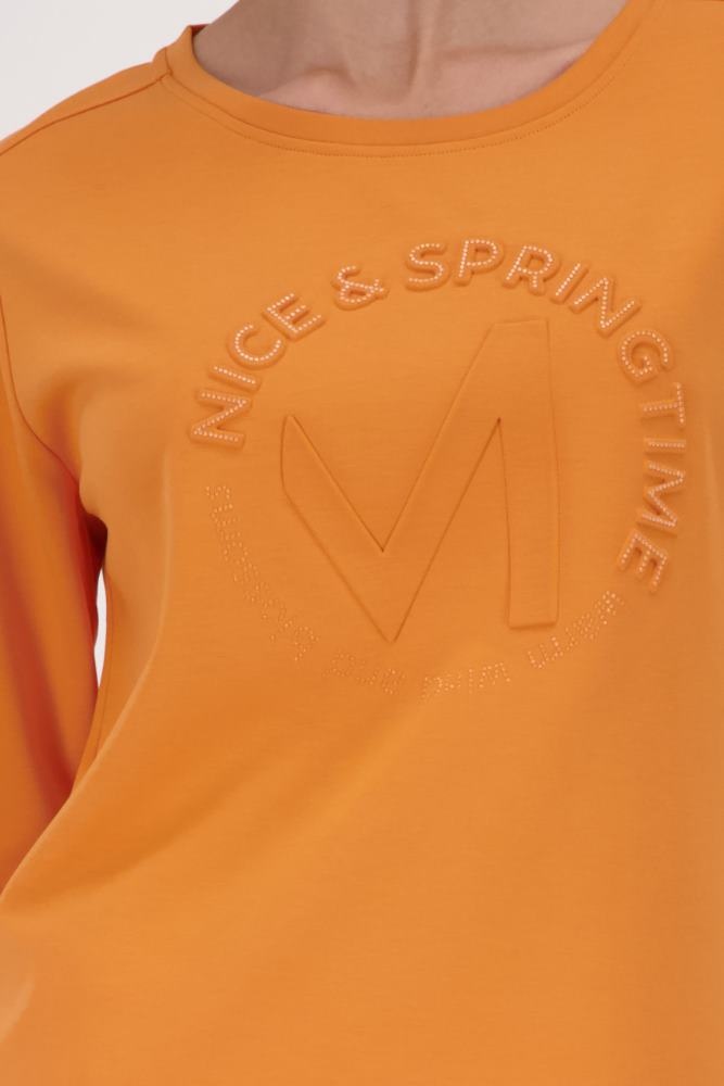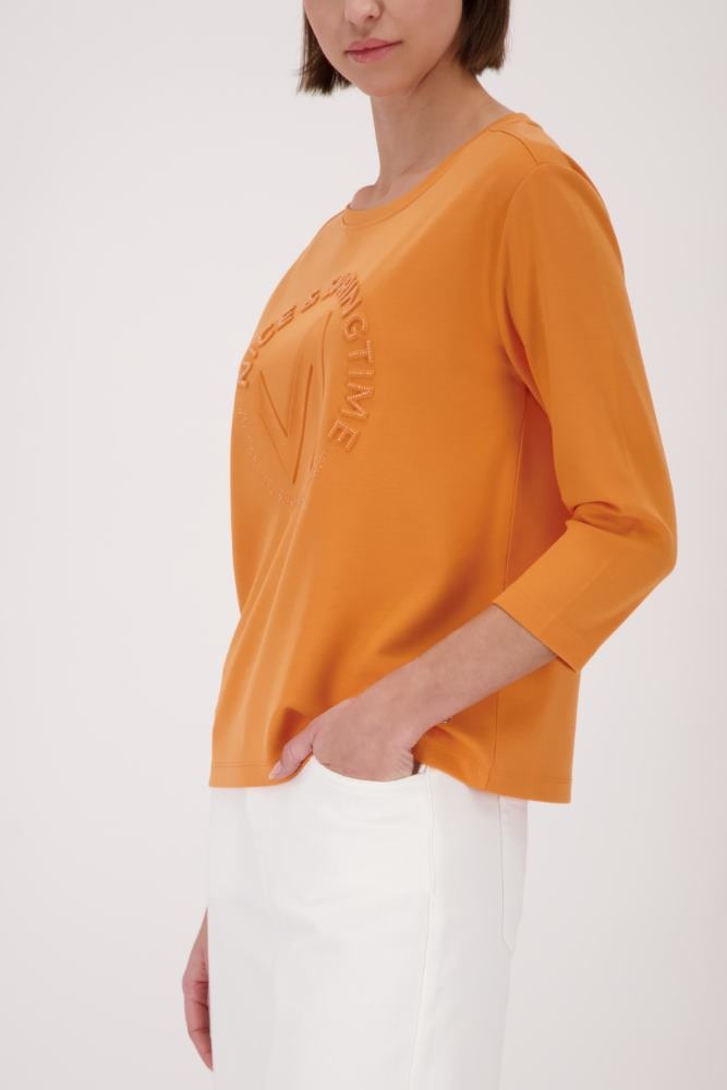 Monari Sweater in de Kleur Burned Orange met ronde hals, 3/4 mouwen en een ingedrukte ronde tekst op de voorkant.