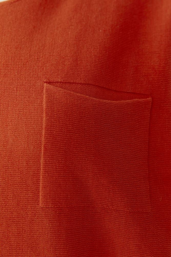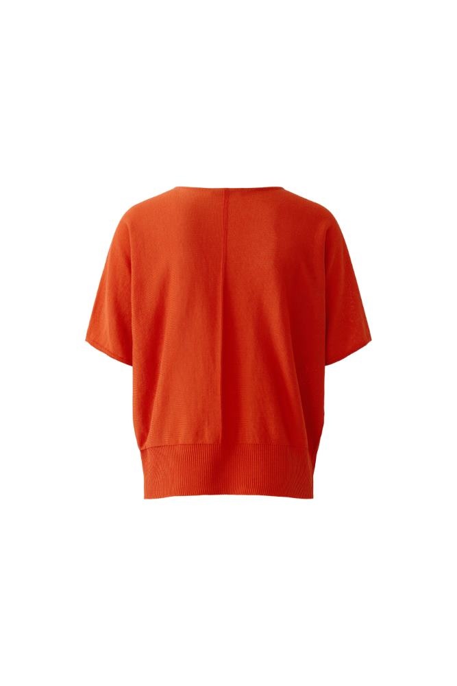 OUI Pullover in de Kleur Burned Orange met ronde hals, korte mouwen en opgestikte borstzak. Een mooie dunne kwaliteit pullover.