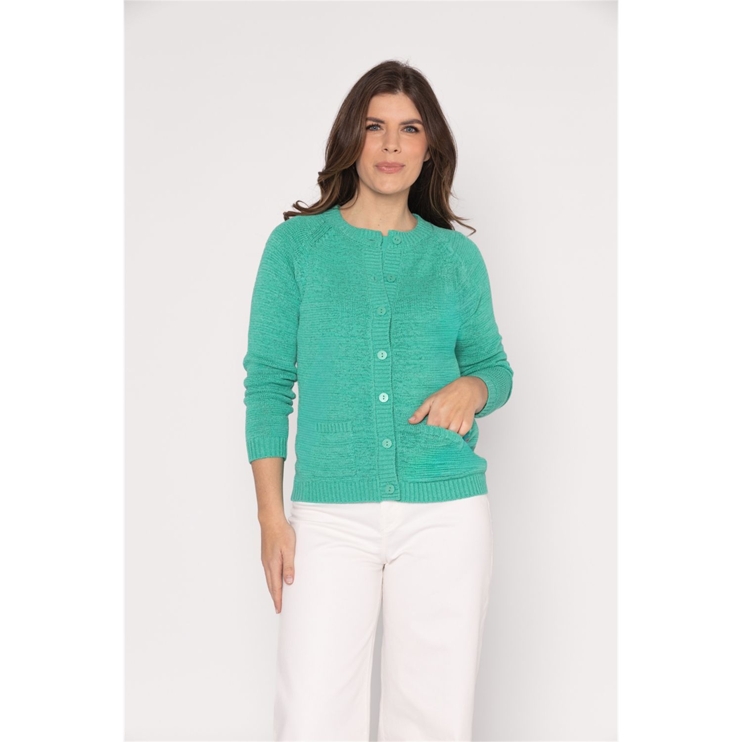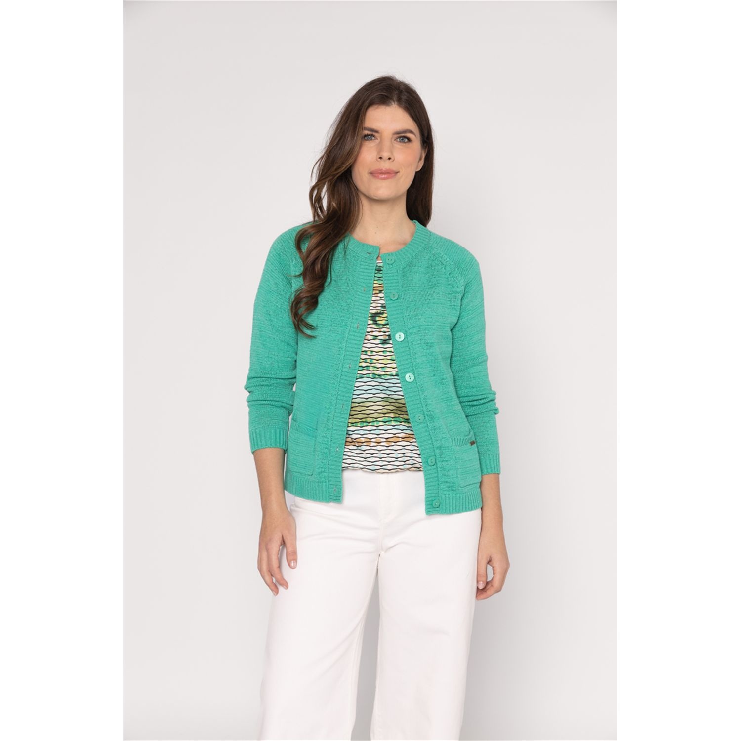 Roberto Sarto Vest in de Kleur Groen in bandjesgaren met ronde hals, lange mouwen en 2 opgestikte zakken.