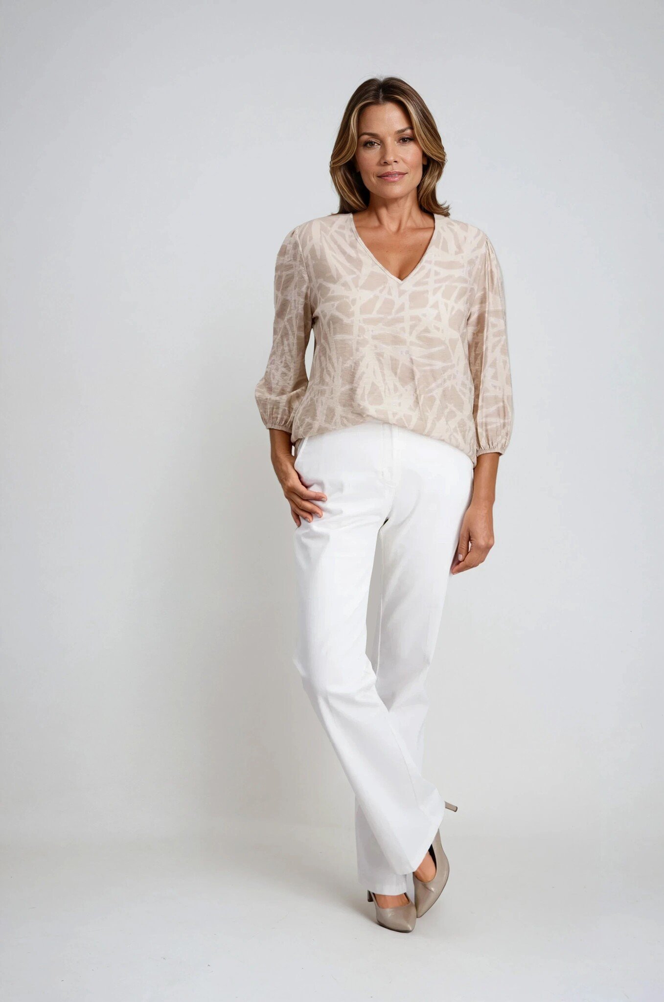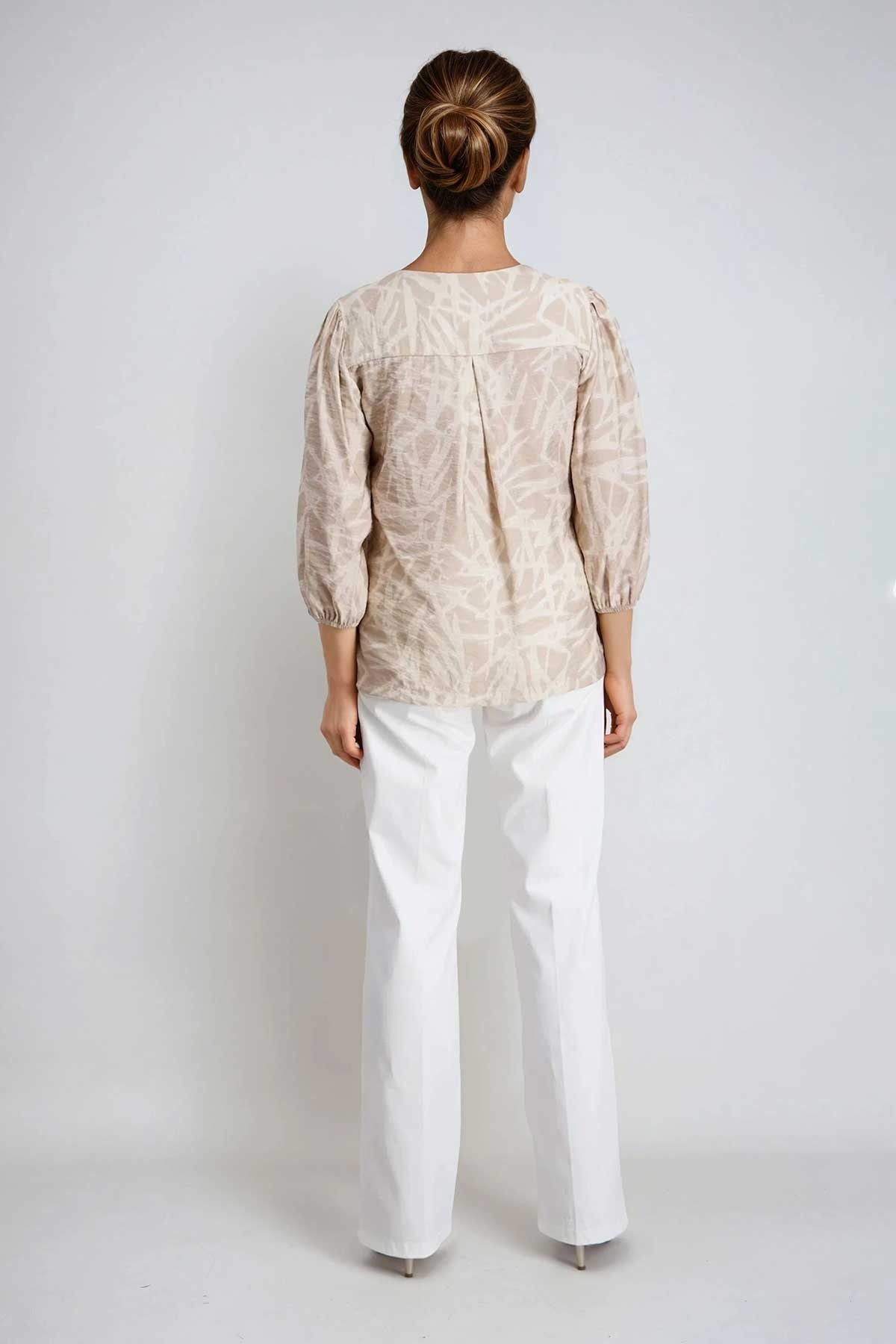 Signe Nature Blouse in de Kleur Zand met V hals, 3/mouwen en geheel in een print.