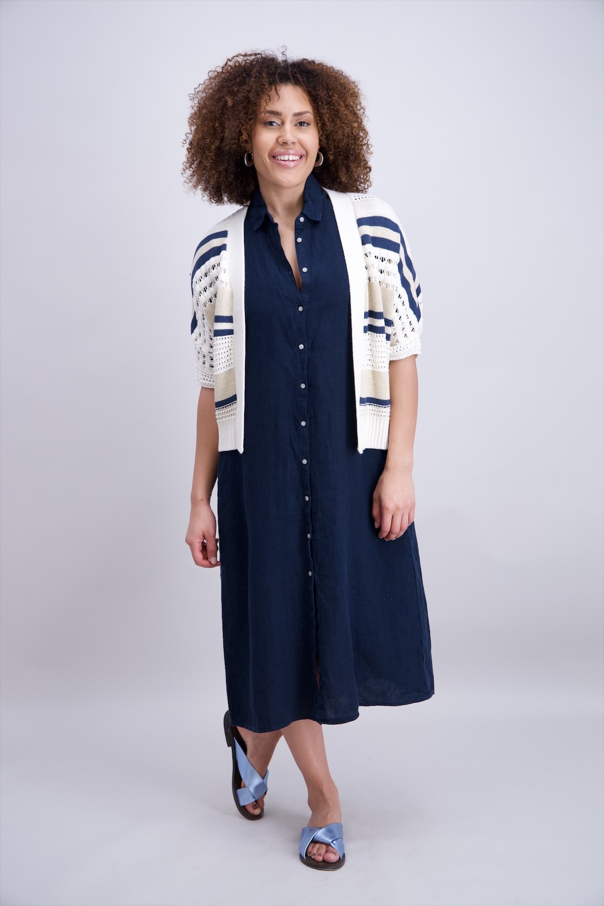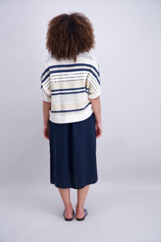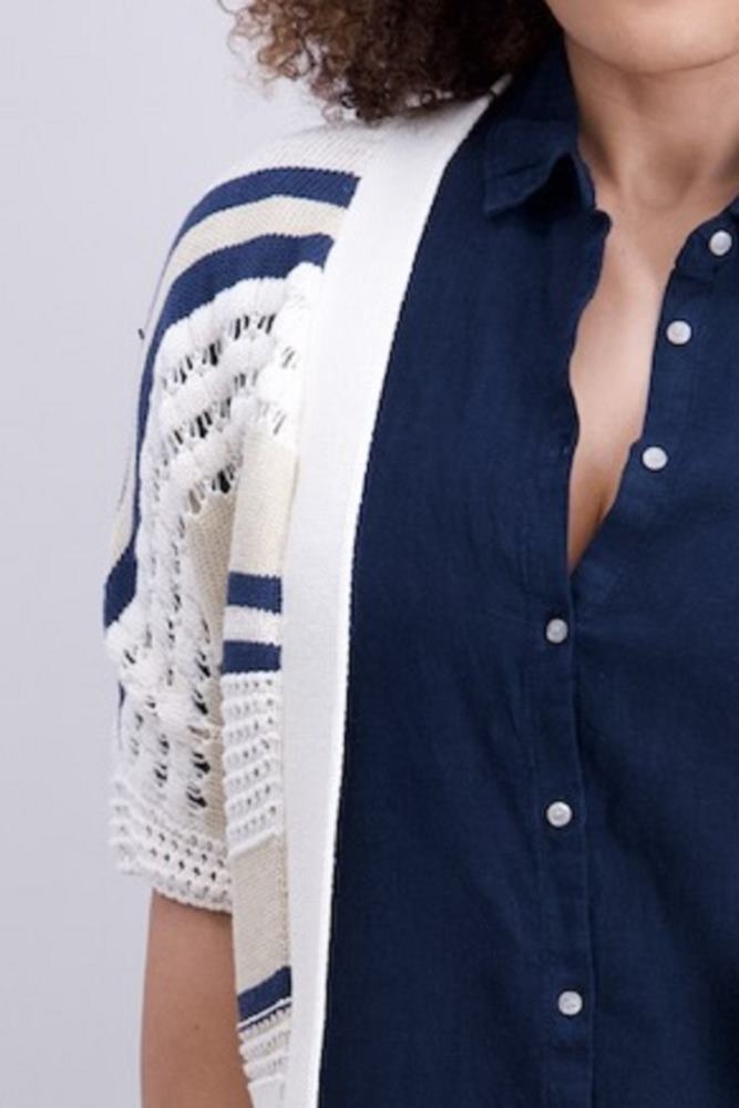 Signe Nature Vest in de Kleur Ecru/Marine/Zand Combinatie in een losvallend model en korte mouwen.