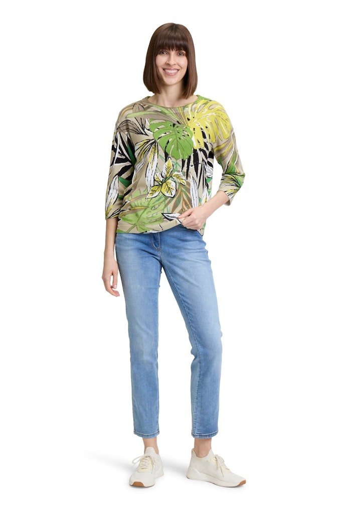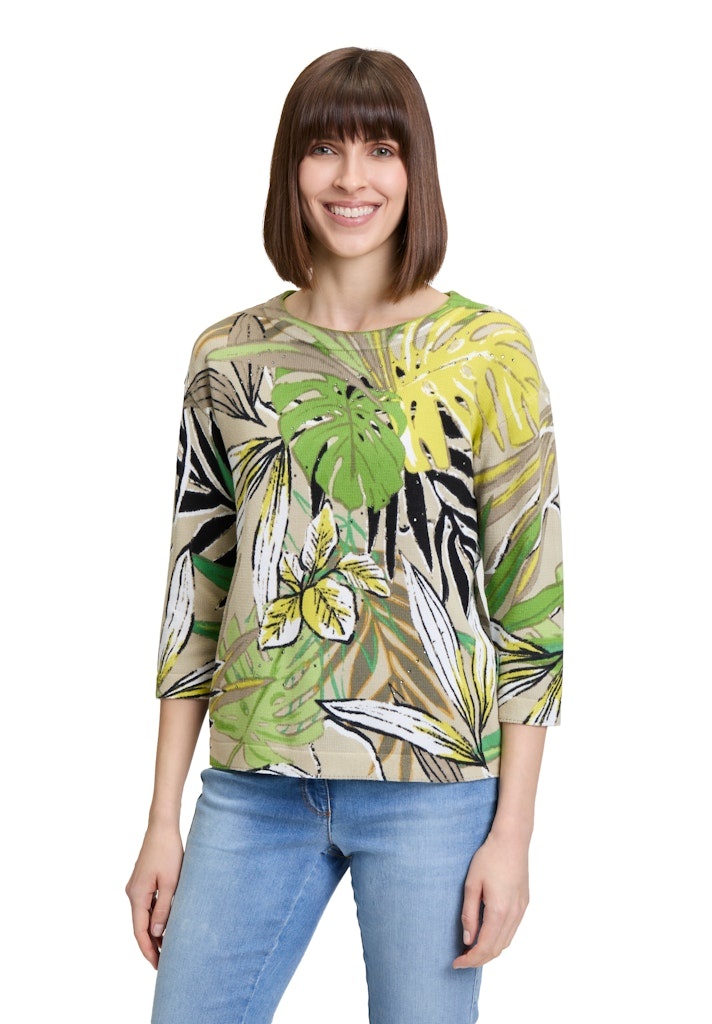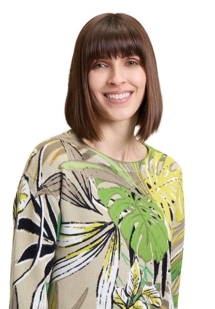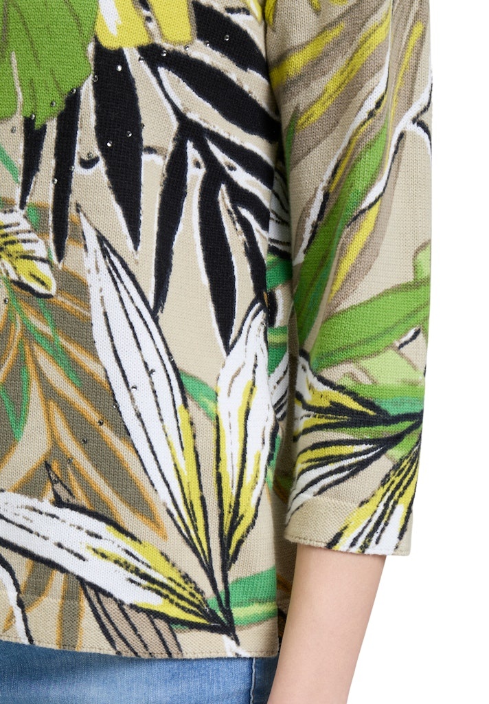 So Cosy Pullover in het Khaki Combinatie met ronde hals, 3/4 mouwen en geheel in ene jungle bladprint.