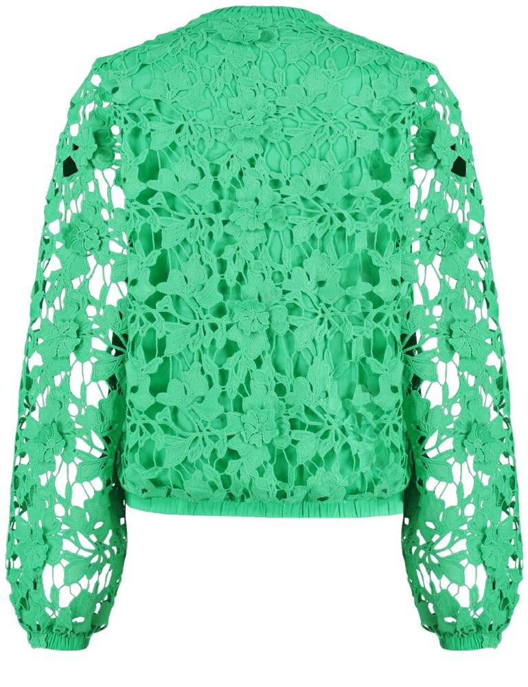 Taifun Jasje in de kleur Groen met ronde hals, ritssluiting, geheel in kant met voering behalve de mouwen. Die zijn ongevoerd en iets gepoft.