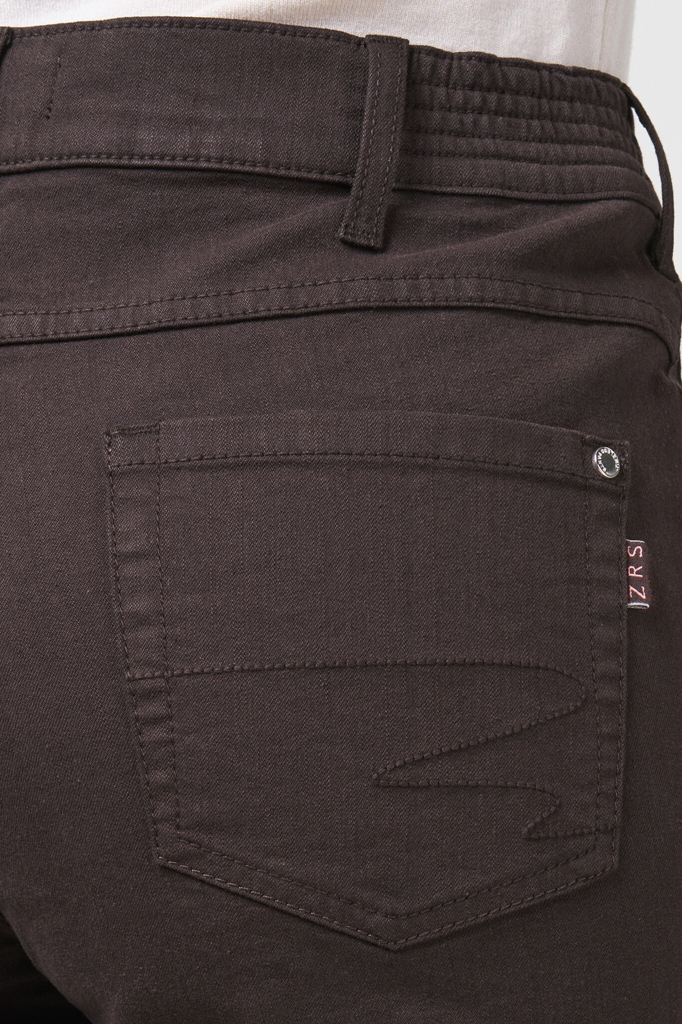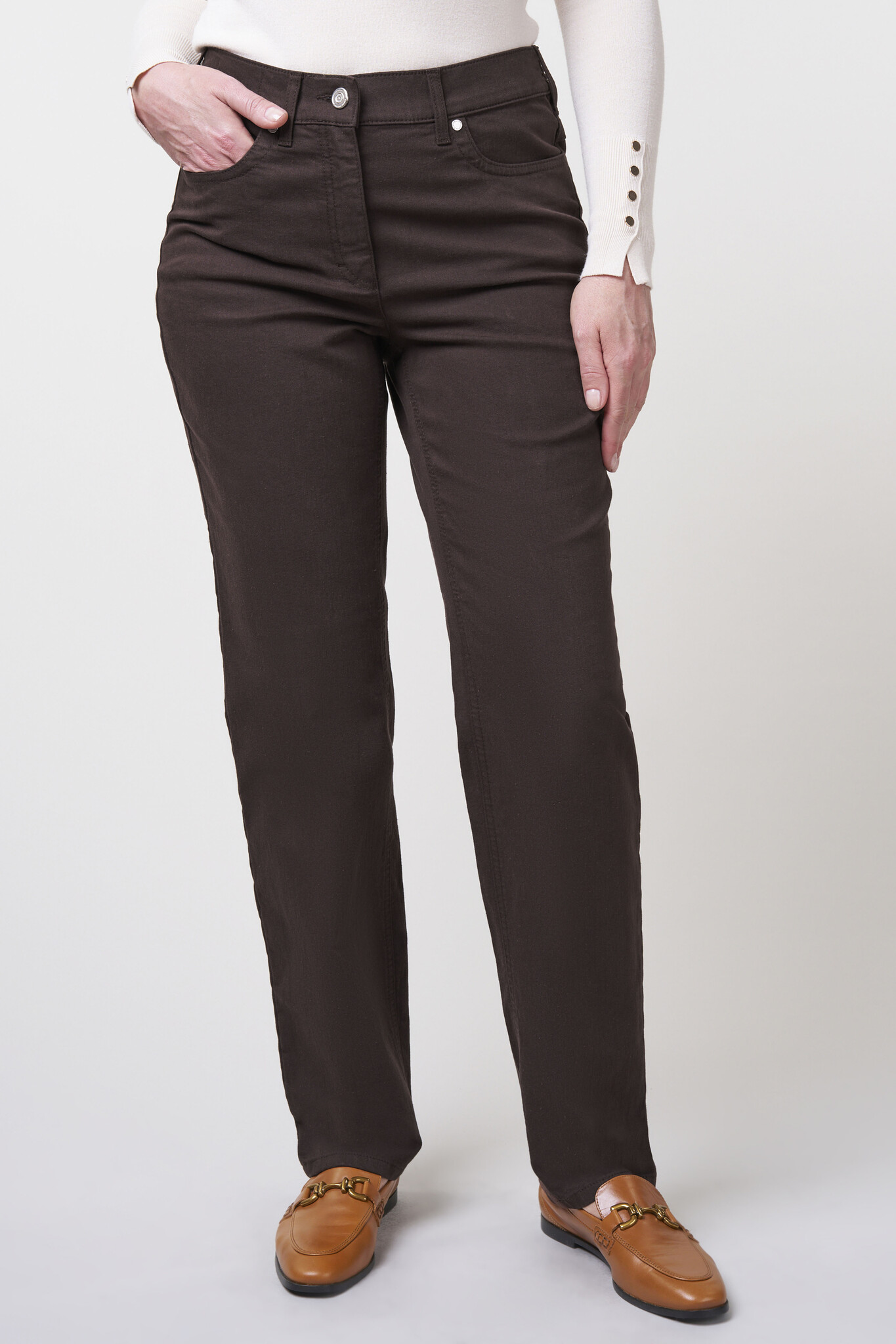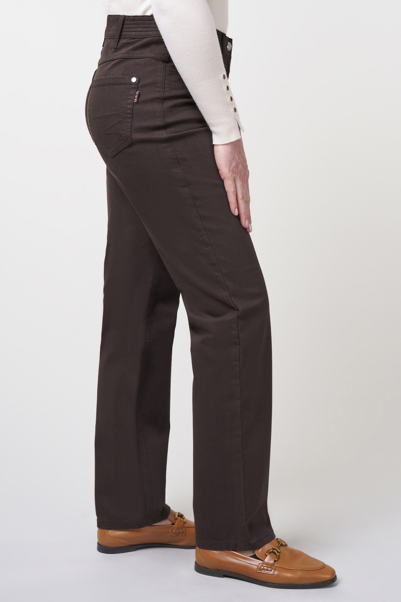 ZRS Zerres Jeans Model Gretha in de Kleur Bruin met knoopssluiting en elastiek in de band, 5 pocket en recht beenverloop.